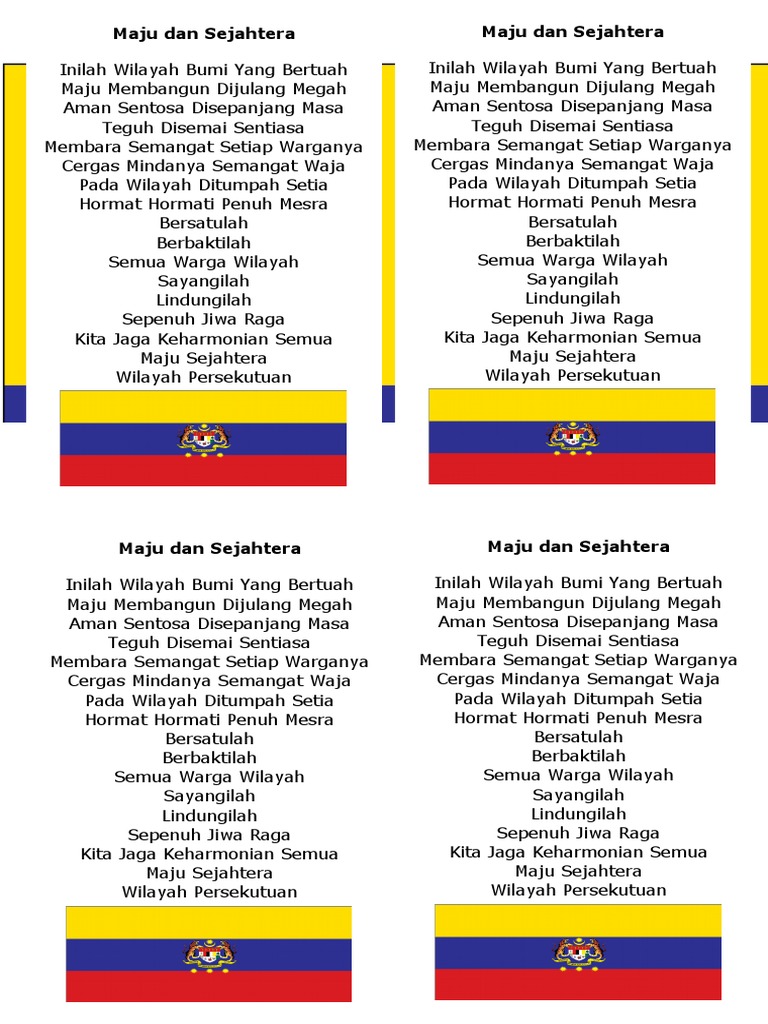 Lirik Lagu Wilayah Persekutuan 1 Pdf from imgv2-2-f.scribdassets.com Maju dan sejahtera adalah lagu resmi untuk tiga wilayah persekutuan malaysia, yang terdiri dari kuala lumpur, labuan, dan. Allahyarham dato' sudirman hj arshad lirik olahan semula oleh: Lirik lagu dan video klip. (lambang harimau berjuang) melambangkan wilayah persekutuan sebagai jajahan penting yang meneraju pemerintahan, pentadbiran dan pusat perniagaan negara. Jangan lupa like and subscribe. Harmoni wilayah pertiwi semoga sentiasa diberkati wawasan hala pembangunan sebagai semangat perpaduan wilayah persekutuan maju dan sejahtera maju dan sejahtera. Ini ialah video lirik lagu kebangsaan wilayah persekutuan di malaysia iaitu maju dan sejahtera. Patriotisme bukan hanya di medan perang.